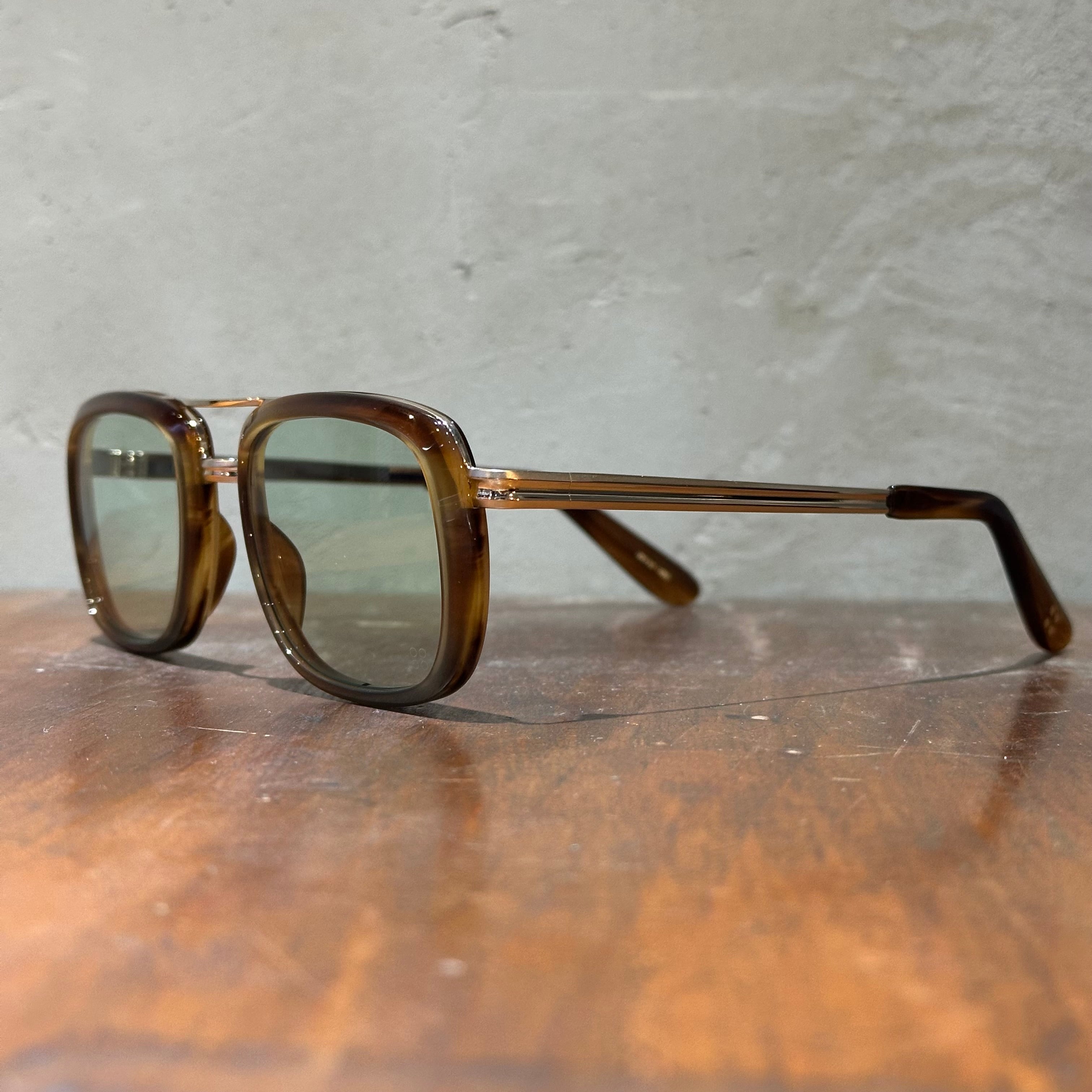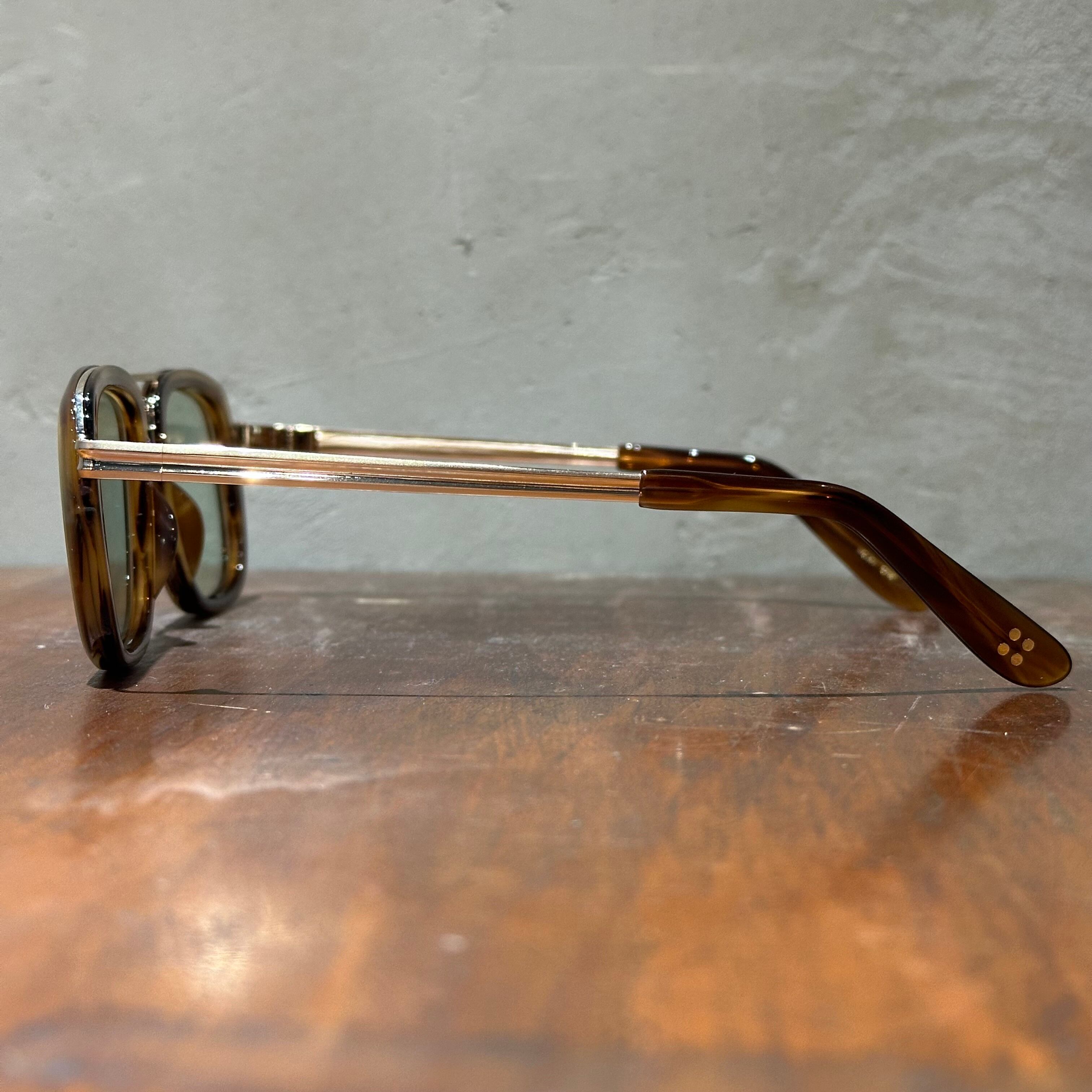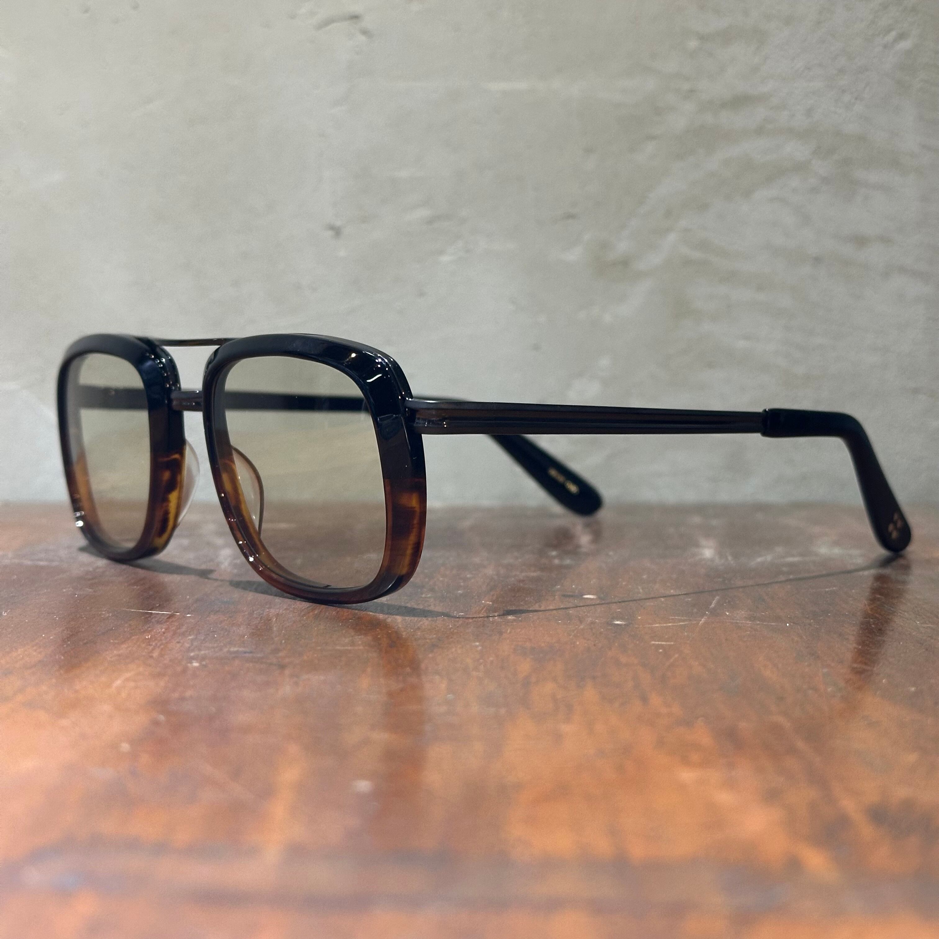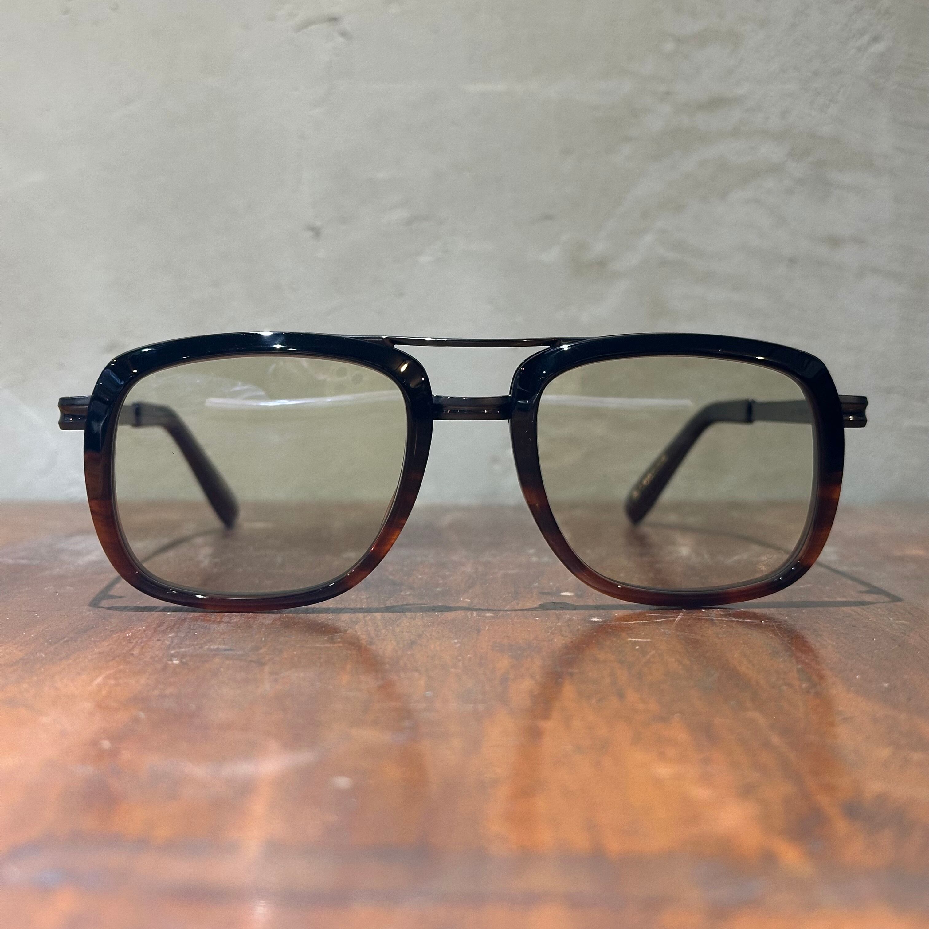 70'sのドイツ製アイウェアのようながっしりとしたメタルバーに、ボリューム感のあるアセテートリムを組み合わせたツーブリッジフレーム。