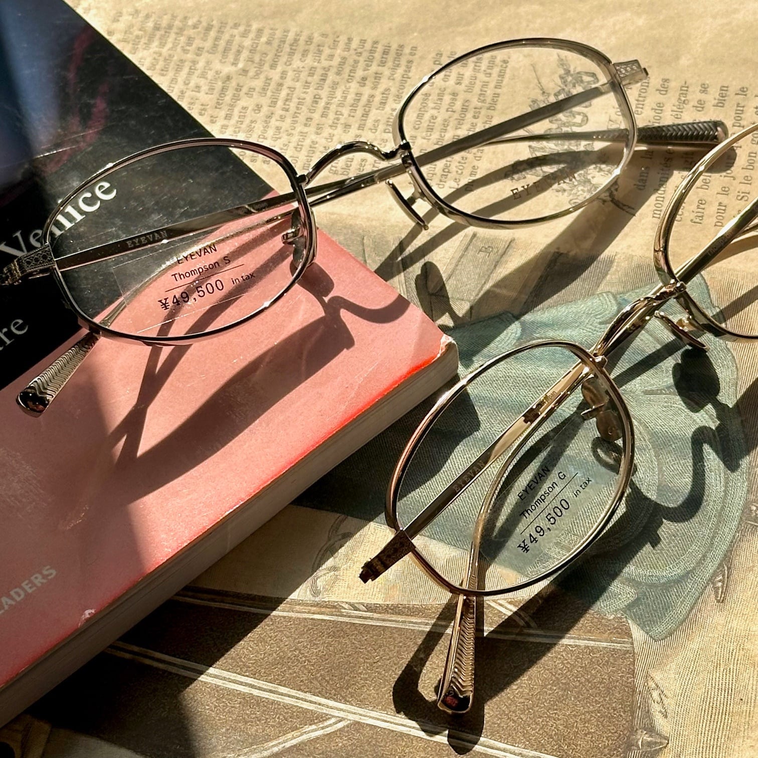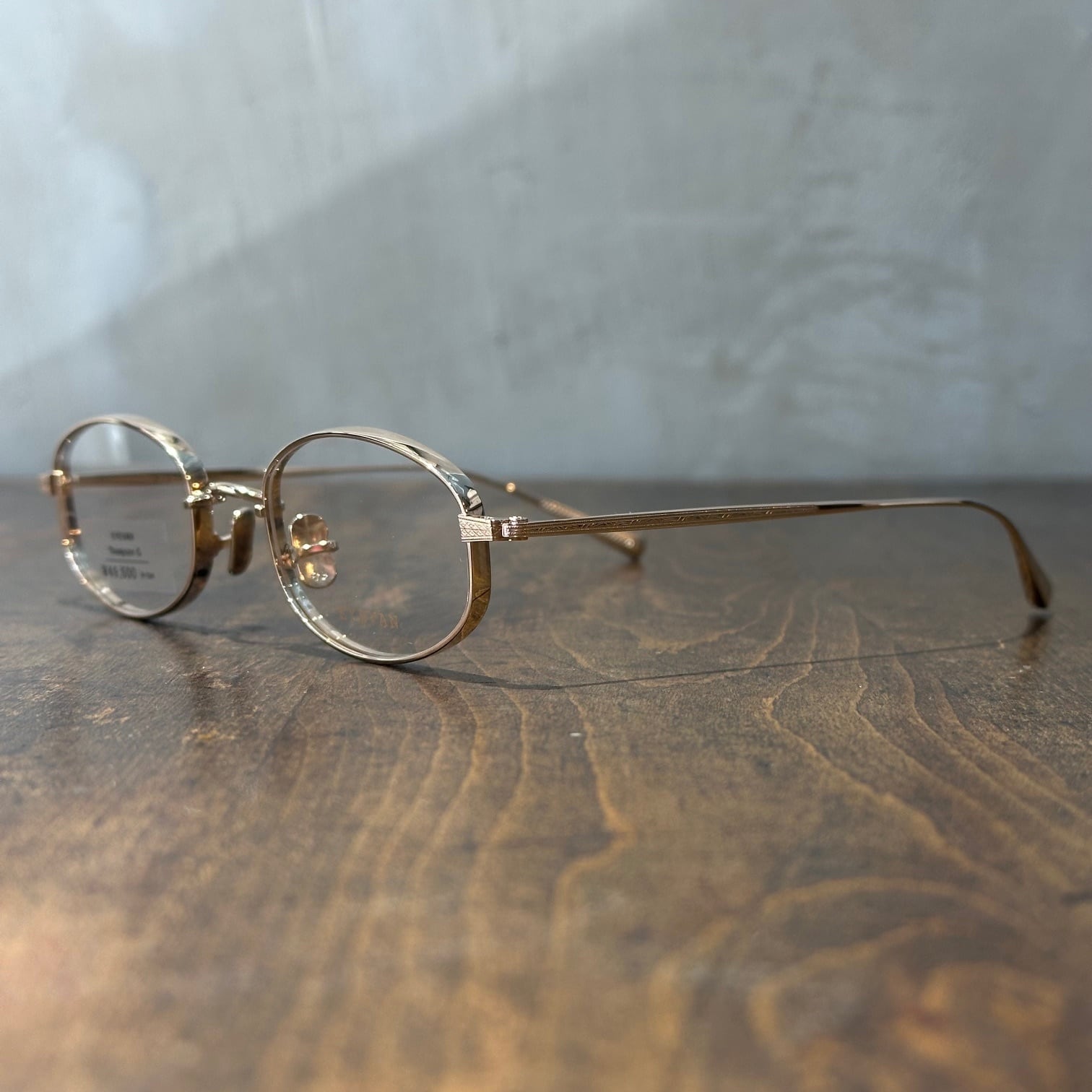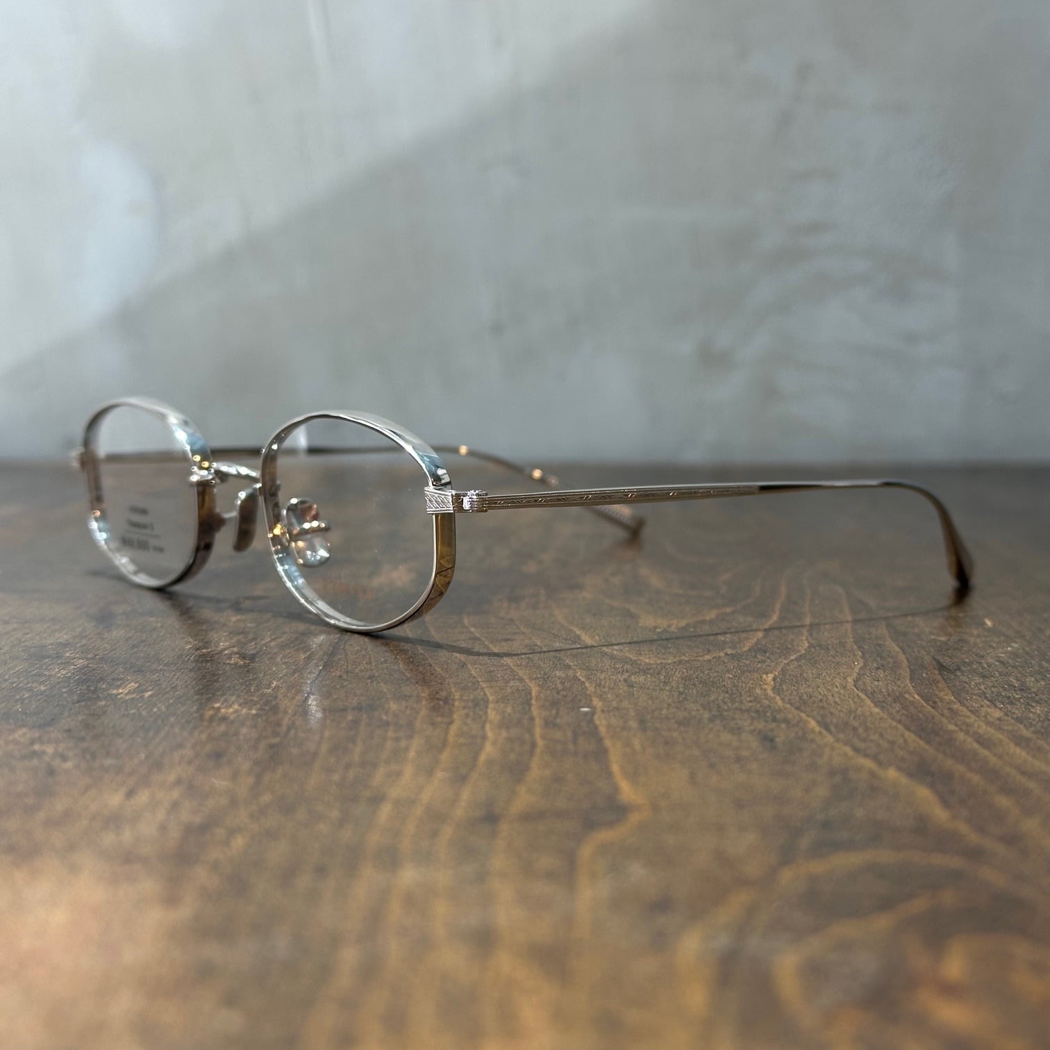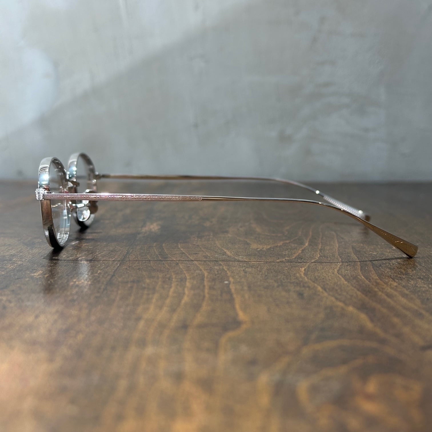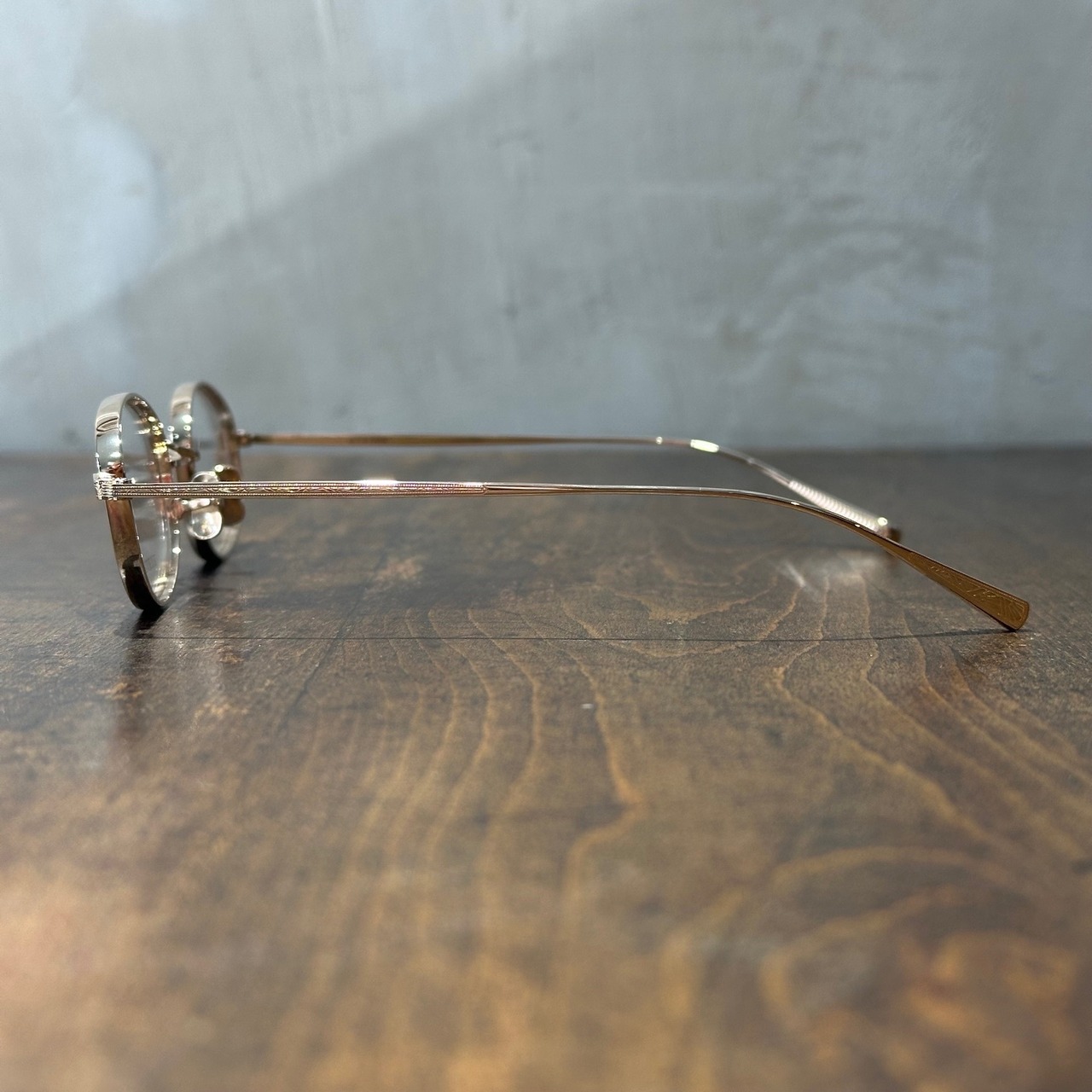 ヨロイからテンプルにかけて刻まれた繊細な模様と、レンズシェイプとブリッジが織り成す曲線が美しい、品のあるフレームです。